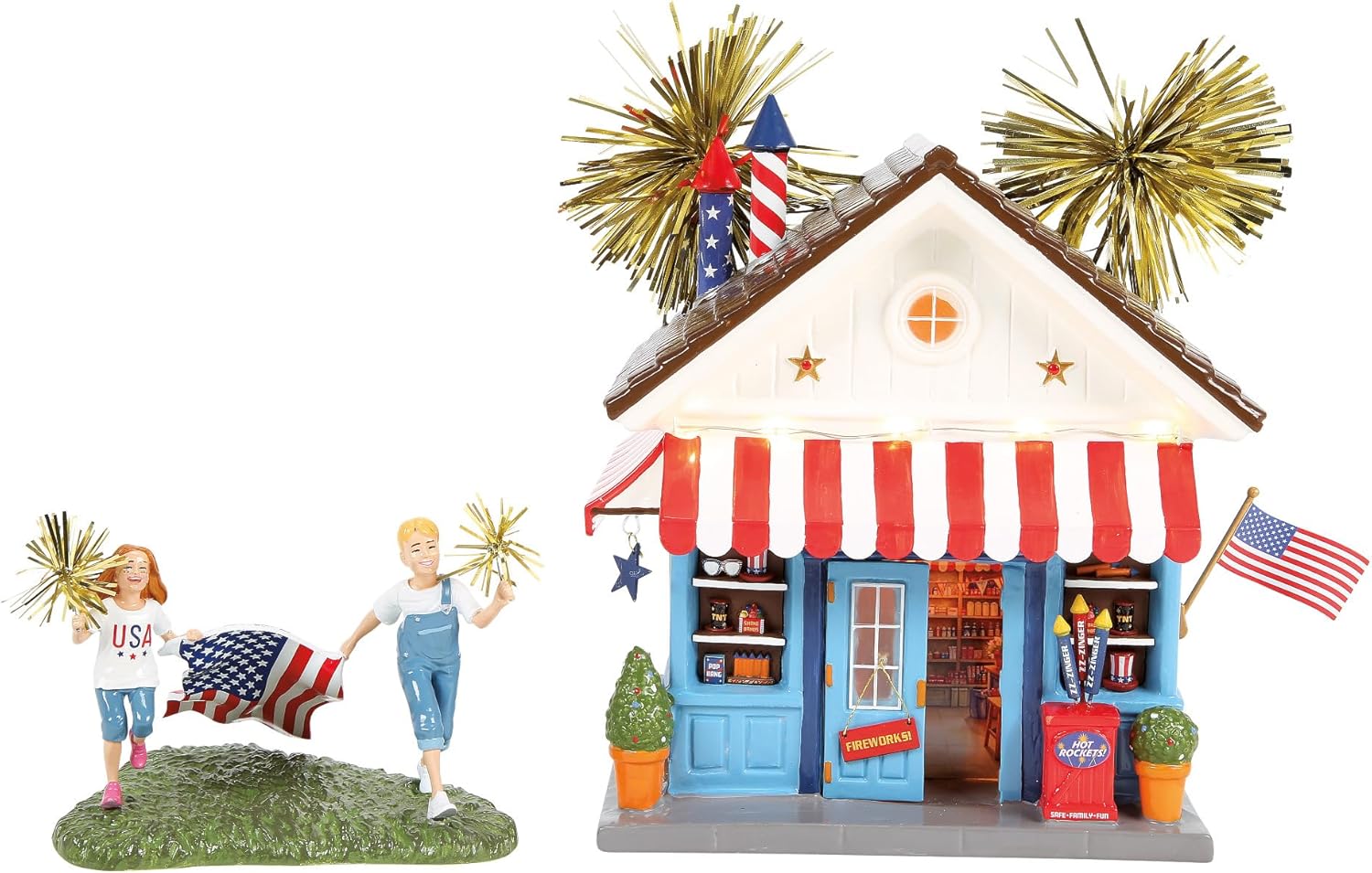 TWO-PIECE SET: celebrates the 250th anniversary of the USA with a light-up Firework shop and two children holding the flag and sparklers