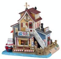 Lemax Collection Plymouth Corners The Rusty Anchor Deep Sea Charter Fishing Lemax # 15755 The Rusty Anchor Deep Sea Charter Fishing building is a charming wooden fishing cabin sitting right on the water. The charter boat, Lisa Marie, is docked on the side of the building, waiting for the next round of passengers. The building's main walk-up window has everything you need for fishing, from rods, to bait and lures. The dock wraps around the colorful building and has stairs that lead to the second floor, which is being watched over by a pair of seagulls. Approx. size (H x W x D) 7.76 x 7.44 x 6.02 inches 19.7 x 18.9 x 15.3 cm Year Released: 2021 Made of: Porcelain Product type: Lighted Building Control switch: On/Off switch Electrical: With 1.83m cord (6 feet) or with LED light cord with battery box or with LED light cord with adaptor