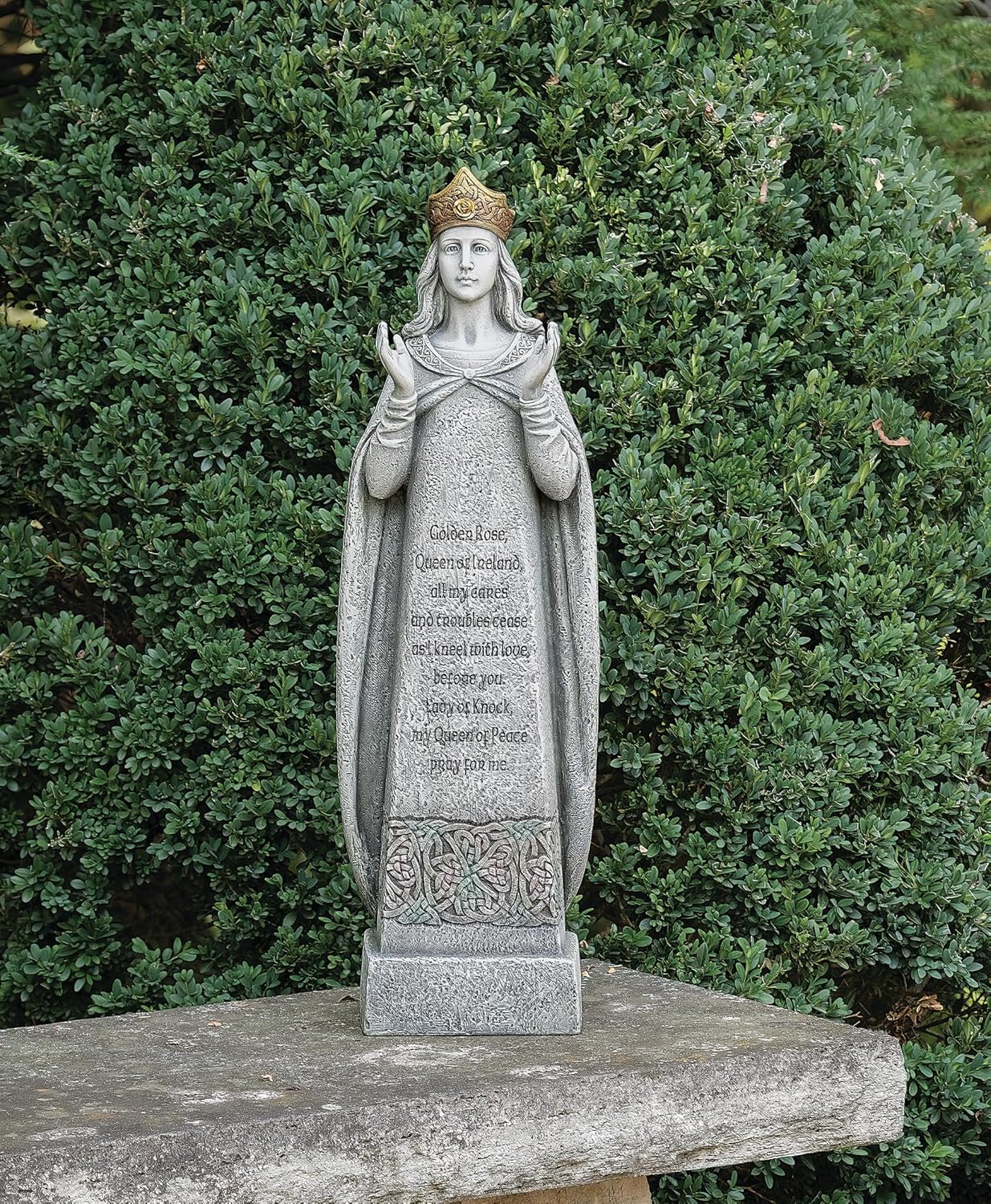 This elegant garden statue radiates grace and devotion, it showcases fine sculpted detail a regal crown. A striking reminder of peace, faith, and divine protection, it makes a meaningful focal point for gardens, prayer spaces, or outdoor sanctuaries.