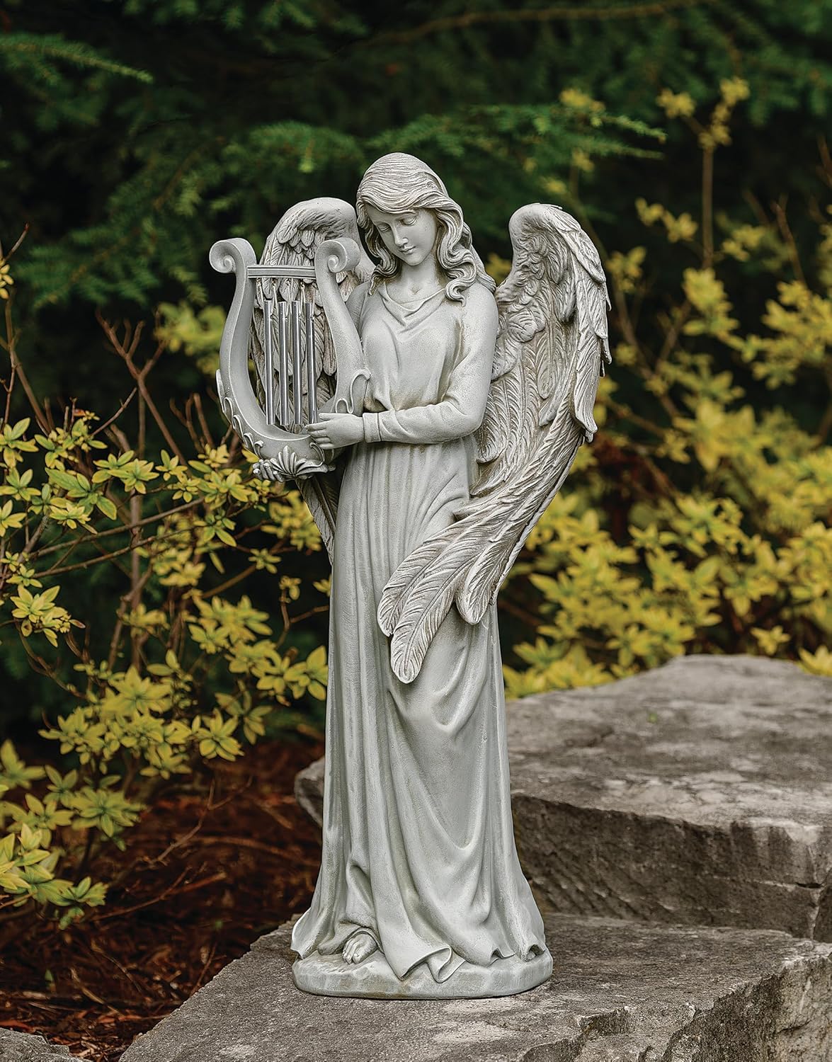 This elegant angel holds a lyre at her side, fingers gently poised as if caught in the middle of a celestial melody. Sculpted wings arch behind her flowing gown, and the metallic lyre adds a subtle shine that contrasts beautifully with the soft stone finish.